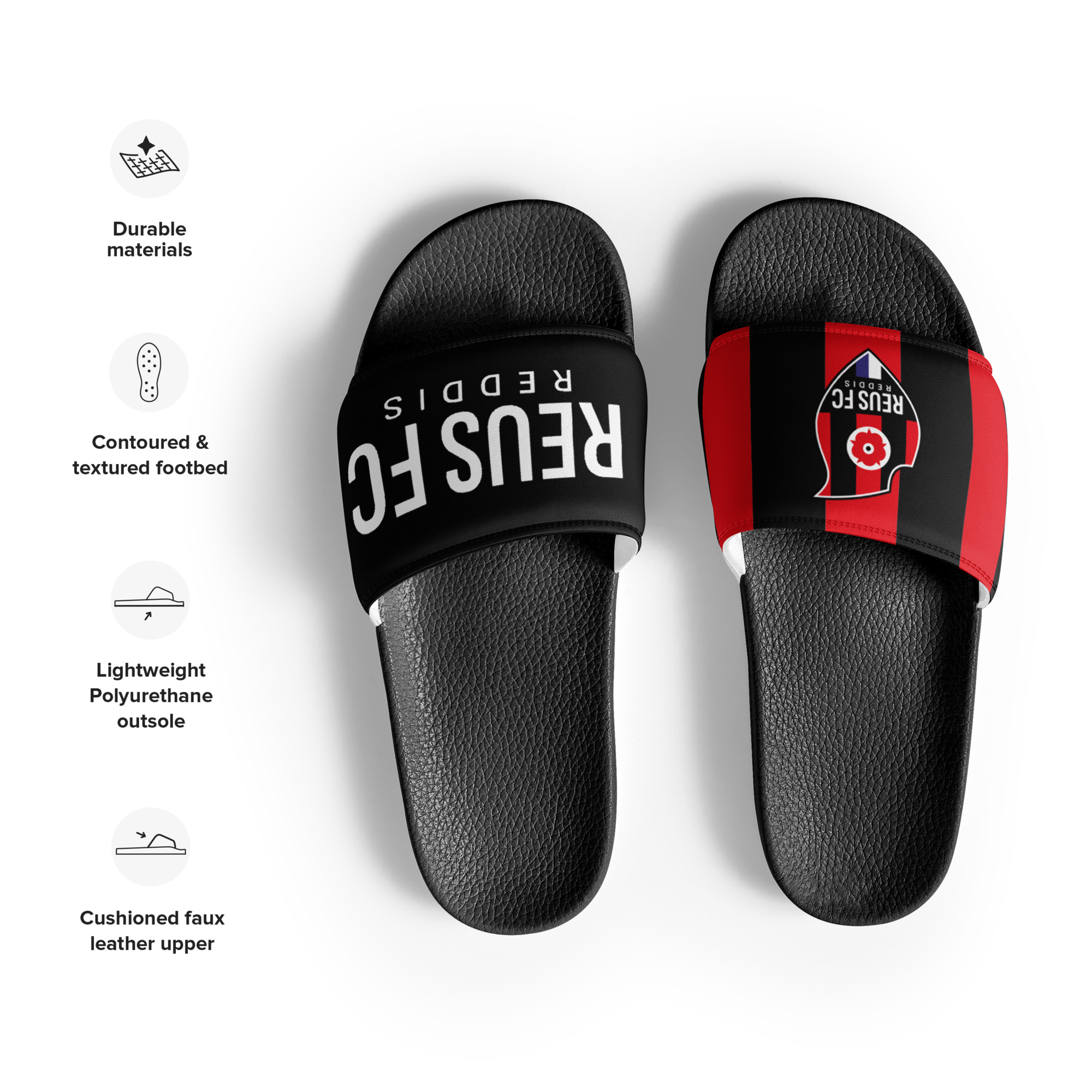 Gaudeix de l’estiu amb les sandàlies per a dona del Reus FC Reddis, pensades per combinar comoditat i estil roig-i-negre. Amb una tira superior en pell sintètica acolxada i una plantilla texturitzada, són perfectes per a dies de platja, piscina o simplement per relaxar-te amb esperit ganxet.